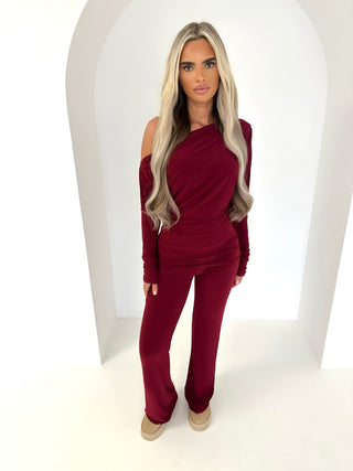 LOLA long sleeve off shoulder slinky flare trouser set BURGUNDY