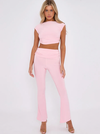 ELIZA slinky frill shoulder crop top flared trouser set BABY PINK