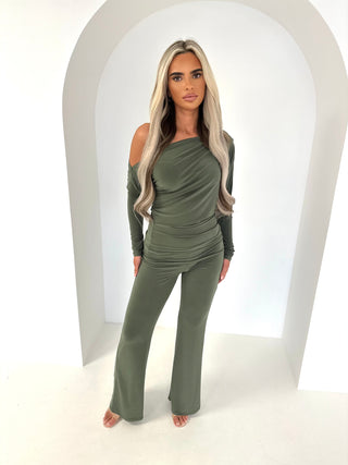 LOLA long sleeve off shoulder slinky flare trouser set KHAKI
