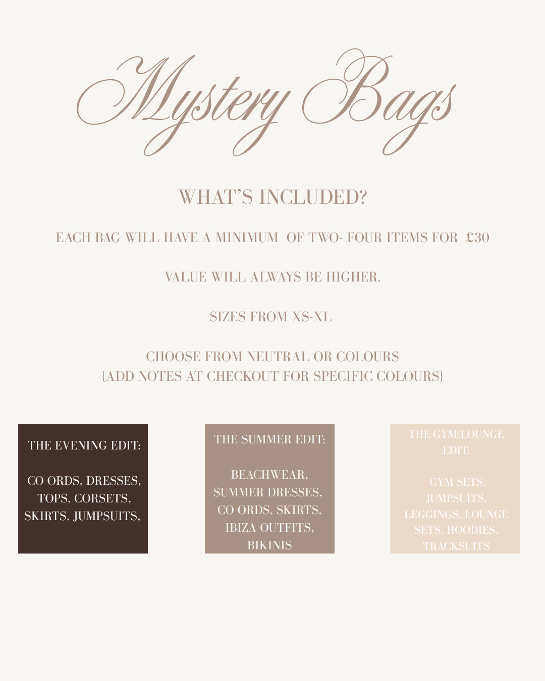 Each bag includes a minimum of 2–4 items from our going-out collection for just £30, with a total value always exceeding the purchase price.