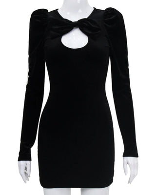 POLLY velour puff sleeve bow front cut out mini dress BLACK